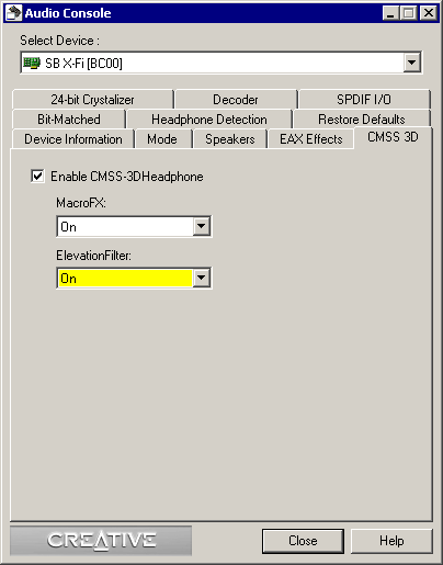 If your card supports EAX modes, try those too. However, when using EAX, make sure you switch to the “plain” environment for apples-to-apples testing. For some reason it defaults to “generic”, which colors the sound a bit.