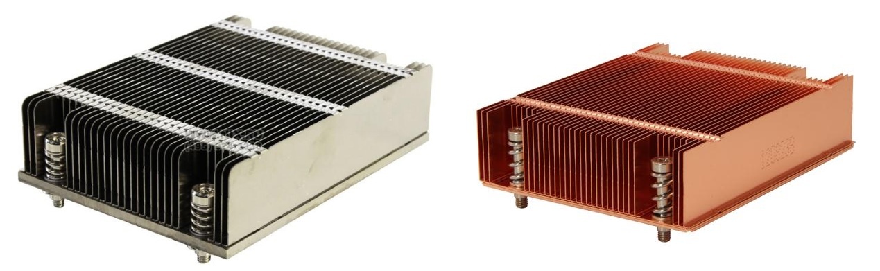 Copper is significantly more expensive, plus heavier and harder to work with, so it's generally easier to throw an ever-larger mass of aluminum at the cooling problem when you can. But when space is a constraint, as it is with a 1U server, copper dissipates more heat in the same form factor.
