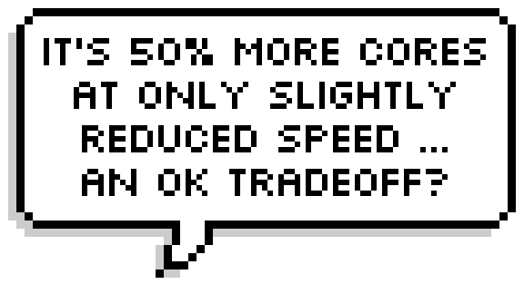 Yes, there are server CPUs with even more cores, but if you have to ask how much they cost, you definitely can't afford them … and they're clocked even slower. What we do is serviced better by a smaller number of super fast cores than a larger number of slow cores, anyway.