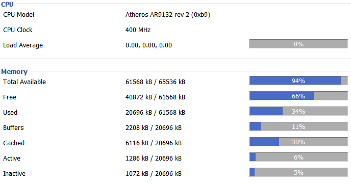 Worried your router is running low on embedded CPU grunt, or that 64 megabytes of memory is insufficient? Never fear; dd-wrt has you covered. Just check out the detailed, real time memory and cpu load stats.