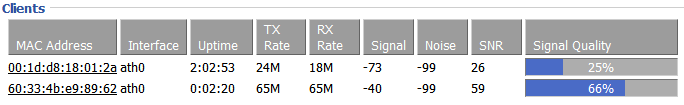 After rebooting, I was in love. The (more) modern gigabit hardware, CPU, and chipset was noticably snappier everywhere, even just dinking around in the admin web pages. And dd-wrt scratches every geek itch I have – putting that newer hardware to great use. Just check out the detailed stats I can get, including that pesky wireless signal strength problem. The top number is the Xbox 360 outside, the bottom number is my iPhone from about 10 feet away.