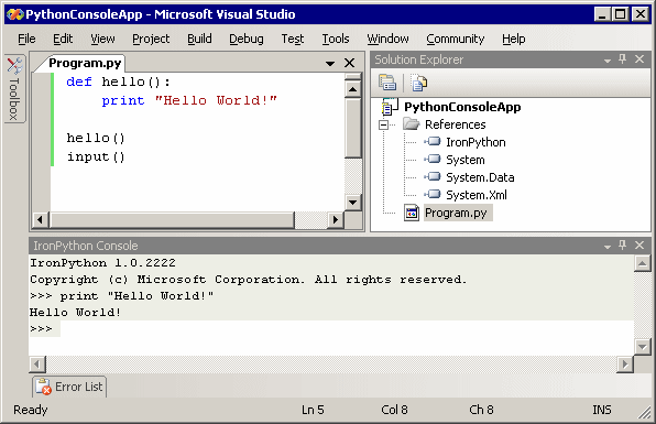 Wasn't this the promise of the .NET runtime-- that we'd have real, meaningful choice of language? That's why I'm so excited about IronPython. IronPython has been a fine proof of concept, but it had no IDE integration. Until now.