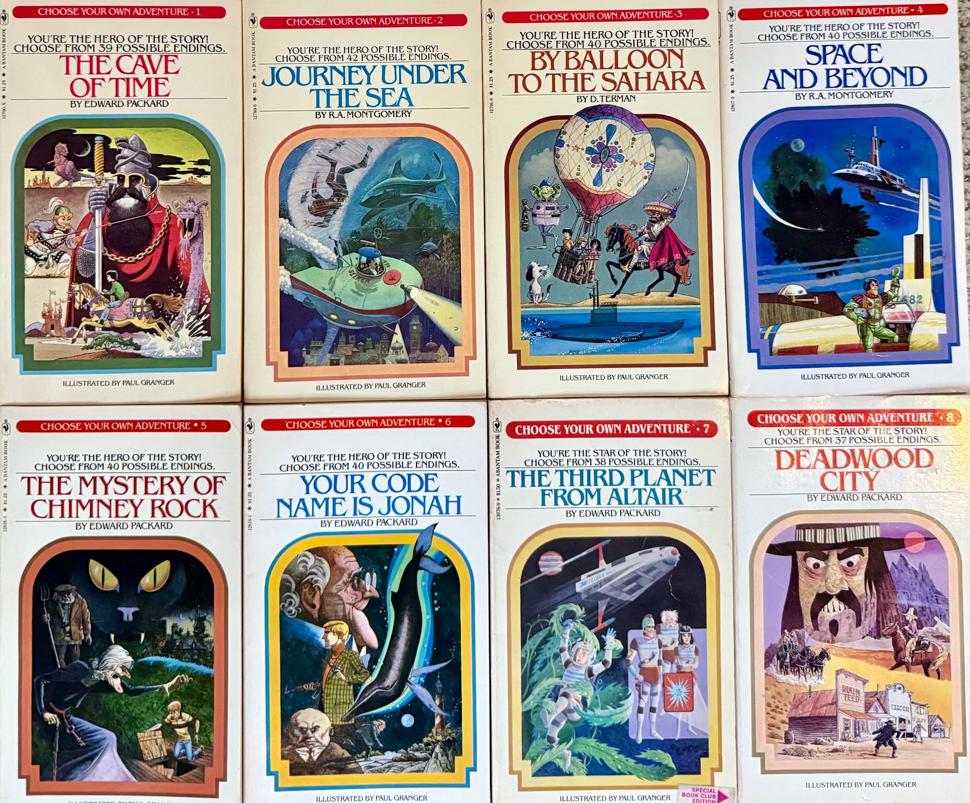 The cover art is just as brilliant, and in full color. Joey DeVilla put together a great montage of the original 66 Choose Your Own Adventure book covers. You can pick up the original Cave of Time – with funky, freaky late 1970s art intact – for a mere penny.