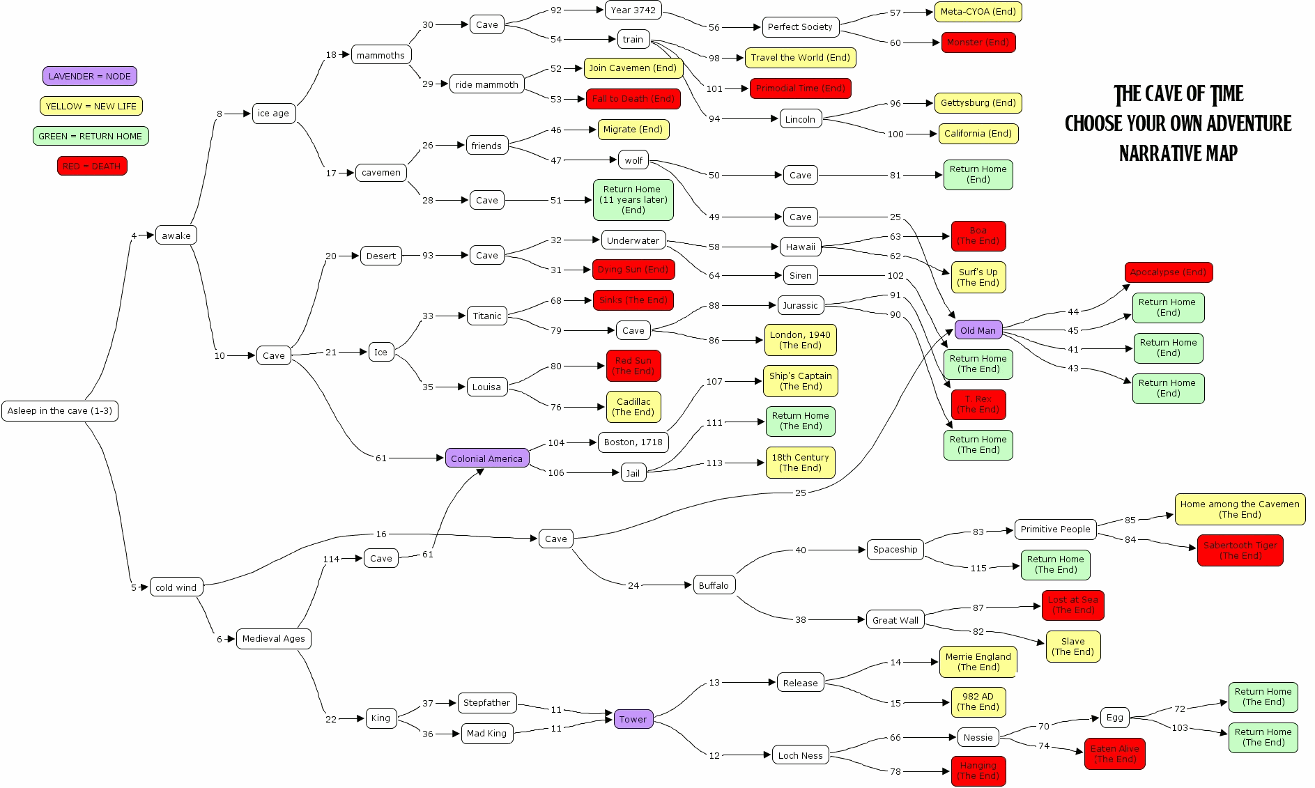 The Choose Your Own Adventure series are early programmer books, I'd say. Whether reading the modern updates, or through inheriting a worn hand-me-down copy, it's encouraging to think that future generations can have the same fun pseudo-programming experience I had reading and re-reading these classic books. Every few pages you make a decision, which leads to a different page in the book. If that sounds like branching and if-then logic – maybe even recursion and stacks – well, it is. Here's a diagram of all possible outcomes in the original Cave of Time book from Mark Sample: