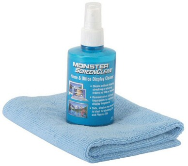 Most manufacturers recommend basic soap and water – no harsh detergents – along with a soft cloth. I’ve used the Monster ScreenClean kit for a while with good results.