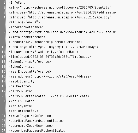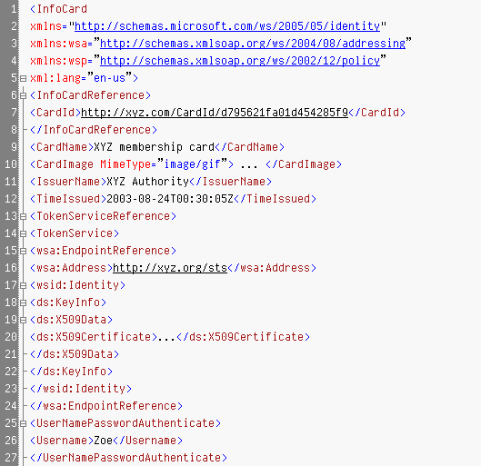 Consider this Infocard XML as you'd see it in a basic Notepad style text editor, perhaps with a little line numbering: