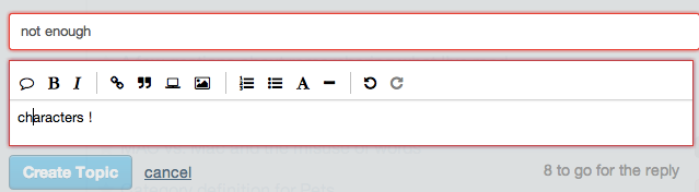 For example, we launched Discourse with a requirement that all topic titles and bodies be above a certain minimum character length, because we believe that extremely short posts and particularly titles aren’t conducive to actual conversation. Philosophically, this is an important default for us, because it strongly relates to our core mission of building software that helps cultivate meaningful conversation on the Internet.