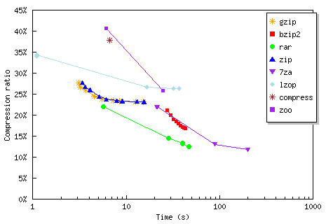 Note that the scale on the bottom of the graph is logarithmic. This is the only comparison I could find that properly expresses compression as the zero-sum game it really is: you can either have efficiency, or you can have speed. That's why, except for the truly obsolete algorithms, you see the "diagonal line" effect on this graph: better compression algorithms always take longer. Sometimes a lot longer. If you're holding out for Hyper Turbo Extreme Compression X algorithm, you may be waiting a while. Consider RAR, which offers the best blend of compression and speed currently available: