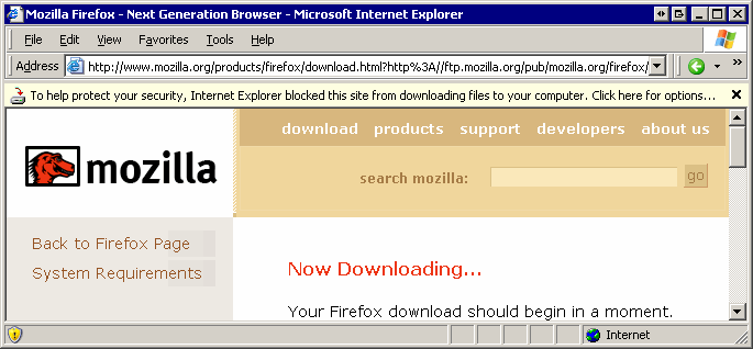But even when following that guideline religiously, you’ll still find yourself painted into corners where you really, really need to let the user know that something happened. Right now. And the current GUI toolkit is woefully inadequate for expressing this to the user. What are my options? Display something in the status bar? The previous versions of IE6 did it exactly that way, at least for certain classes of errors such as JavaScript errors on the page. However, one of the interesting side effects of installing Windows XP SP2* RC2 is that it adds non-dialog based notifications to Outlook Express and IE6. For example, here’s IE6 notifying me that it blocked download of that crazy, dangerous Firefox browser – a clear security risk!