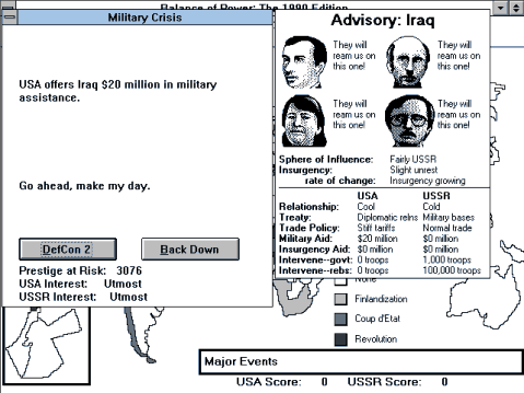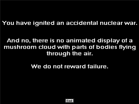 [Defcon] simulates Global Thermonuclear War.Points are scored by successfully nuking the enemy civilian population into oblivion. This is an extremely difficult task because launching an attack on the enemy makes you very vulnerable - Ground Silos and Subs and Bombers all give away their positions the moment they launch nuclear weapons.