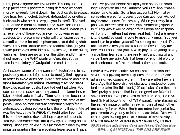 I've used Craigslist quite a few times in the past, mostly to sell things that are too unwieldy to ship, with generally positive results. But that's the "for sale" section, and the spammers seem to be concentrating on the personals and services. I was curious about this, so I delved into the local personals section in what I guessed to be the most popular category. (Note to my wife: this is research! Research! I swear!)