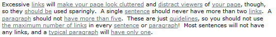 - Don't link everything. Using too many links will turn your text into noise. This works in two dimensions: excessive linking makes text difficult to read, and excessive linking causes deflation in the value of all your existing links. Link in moderation. Only link things important enough to warrant a link.