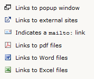 - Don't include icons on every link. If we're linking in moderation, we should be using link icons in extreme moderation. If every other link has an icon, it's noise. Only highly unusual or irregular links should include icons. I'd also argue that your text, if written properly, can easily communicate the type of link as well as an icon can, but this gets into the realm of personal preference.