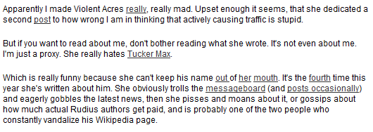 - Don't make your content depend on links to work. Not everyone will click on your hyperlinks. Either they're too busy to click every single link you put in front of them, or maybe they're reading your article in another format where they can't click on the links: print, offline, or mobile. Either way, it's important to provide the context necessary to make your content understandable without the need to visit whatever is behind those hyperlinks. (If you're wondering what this example is about, I should warn you – it's not worth it. For once the inanity of Digg comments was totally appropriate: "retarded blog war".)