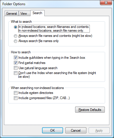 Most notably, your search terms will only extend to file contents in indexed locations. I’m also very glad to see search now ignores compressed files by default. This was a real pain in XP, which insisted on digging through 600 megabyte ZIP files as a part of any search.