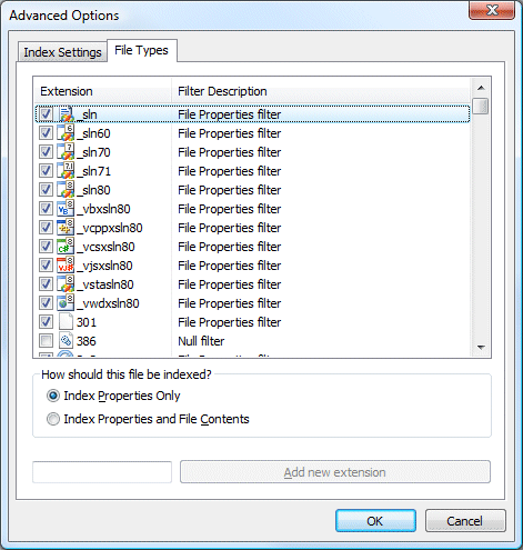 There is one big caveat here: the full-text indexer only indexes file extensions that it understands. To view or modify the list of file extensions the indexer understands, click the Advanced Options button on the Modify Index Locations dialog, then select the File Types tab.