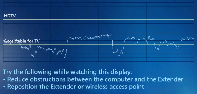 Here are my results from the media extender network test. The test is a bit variable because I’m experimenting with the antenna positioning to see what produces the strongest connection.