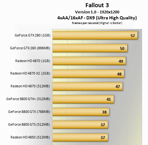 No need to take my word for it, though. I later found some hardware benchmark roundups that confirmed my experience: the GTX 280 is crazy fast in Fallout 3.