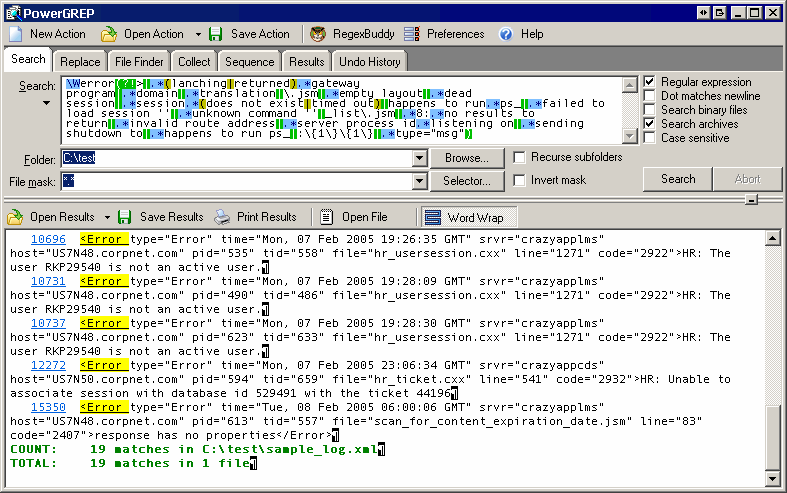 It is, however, a great use for a GREP tool-- basically, regular expressions applied to the filesystem. Let's filter this set of log files to the real errors: