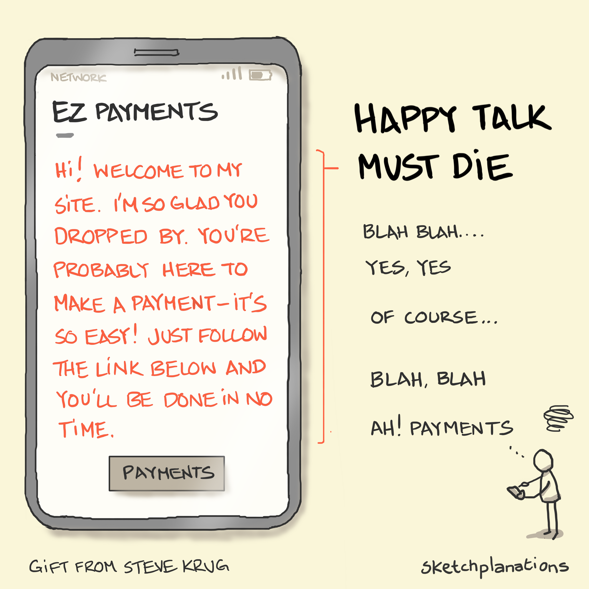 Happy talk is like small talk – content free, basically just a way to be sociable. But most web users don't have time for small talk; they want to get right to the beef. You can – and should – eliminate as much happy talk as possible.