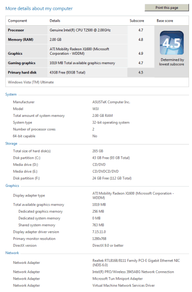 Clicking the View and Print Details button results in a great detailed system summary as well. Here's the Windows Experience Index summary page for my Asus W3J laptop: