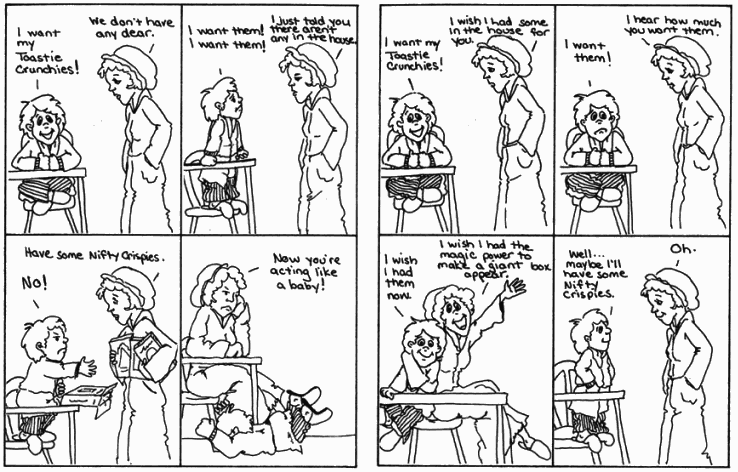 Notice how she cleverly lets the child reach an alternative solution himself, rather than providing the "solution" to him on a silver platter as the all-seeing, all-knowing omniscient adult. This honestly would never have occurred to me, because, well, if we're out of Toastie Crunchies, then we are out of freaking Toastie Crunchies!