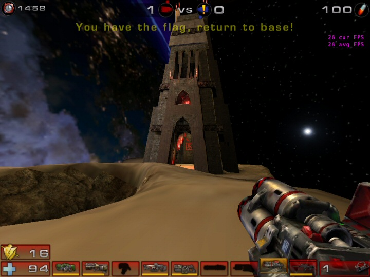 ... from within the game. This Pixomatic software rendered version of the game delivered a solid 40-60 fps experience in capture the flag mode. It ran so well, in fact, that I decided to bump up the detail -- I enabled 32-bit color and bilinear filtering by editing the ut2004.ini file: