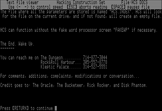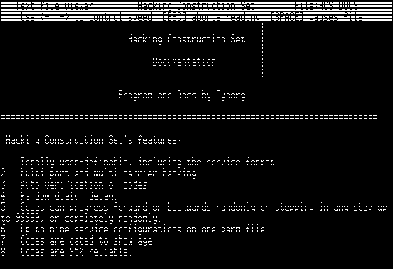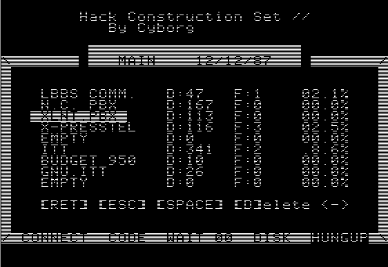 All I had to do is write software to tell the modem to dial over and over and try different combinations. Because I was a self-taught programmer, this was no problem. But because I was an overachieving self-taught programmer, I didn’t just write a program. No, I went off and built a full-blown toolkit in AppleBasic, with complete documentation and the best possible text user interface I could muster, and then uploaded it to my favorite BBSes so every other addict could get their online modem fix, too. I called it The Hacking Construction Set, and I spent months building it. I didn’t just gold plate, I platinum plated this freaking thing, man. (Yes, I know the name isn’t really correct. I read as many 2600 textfiles as the next guy. This is mere phreaking, not hacking, but I guess I was shooting for poetic license. Maybe you could use the long distance dialing codes to actually hack remote machines, or something.)