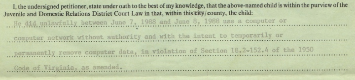 About that trouble. Using my own software got me in trouble with the law. And deservedly so; what I wrote the software to do was illegal. I hired a local lawyer (who, as I recall, was missing a hand; he had a prosthetic hand that was almost impossible not to look at) who represented me. It was quite clear at preliminary hearings that the Chesterfield County court system did not see any computer crime cases, and they had absolutely no idea what to make of me, or what this was all about. All they saw was a smart kid with a bit of bad judgment who loved computers and was headed to the University of Virginia, most likely not a life as a career criminal. So the case was dismissed for the cost of lawyer’s fees. Which, for the record, I had to pay myself, using my income as a Safeway cashier.