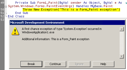 Unhandled Exception: System.Exception: This is a Form_Paint exception at WindowsApplication1.Form1.Form1_Paint(Object sender, PaintEventArgs e) in WindowsApplication1Form1.vb:line 50 at System.Windows.Forms.Control.OnPaint(PaintEventArgs e) at System.Windows.Forms.Form.OnPaint(PaintEventArgs e) at System.Windows.Forms.Control.PaintWithErrorHandling(PaintEventArgs e, Int16 layer, Boolean disposeEventArgs) at System.Windows.Forms.Control.WmPaint(Message& m) at System.Windows.Forms.Control.WndProc(Message& m) at System.Windows.Forms.ScrollableControl.WndProc(Message& m) at System.Windows.Forms.ContainerControl.WndProc(Message& m) at System.Windows.Forms.Form.WndProc(Message& m) at System.Windows.Forms.ControlNativeWindow.OnMessage(Message& m) at System.Windows.Forms.ControlNativeWindow.WndProc(Message& m) at System.Windows.Forms.NativeWindow.DebuggableCallback(IntPtr hWnd, Int32 msg, IntPtr wparThe program '[2856] WindowsApplication1.exe' has exited with code 0 (0x0). am, IntPtr lparam) at System.Windows.Forms.UnsafeNativeMethods.DispatchMessageW(MSG& msg) at System.Windows.Forms.ComponentManager.System.Windows.Forms.UnsafeNativeMethods+IMsoComponentManager.FPushMessageLoop(Int32 dwComponentID, Int32 reason, Int32 pvLoopData) at System.Windows.Forms.ThreadContext.RunMessageLoopInner(Int32 reason, ApplicationContext context) at System.Windows.Forms.ThreadContext.RunMessageLoop(Int32 reason, ApplicationContext context) at System.Windows.Forms.Application.Run(Form mainForm) at WindowsApplication1.Class1.Main() in WindowsApplication1Class1.vb:line 4