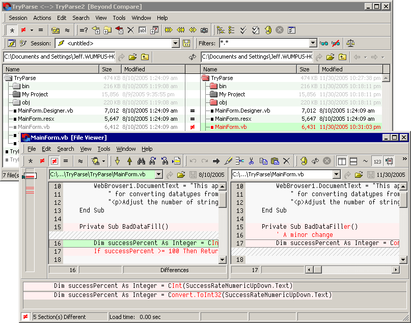 It's a shame that Beyond Compare isn't listed in more "favorite tool" lists. This amazing little folder and file differencing tool has earned its spot in my core toolset a dozen times over. Here's a screenshot of it in action: