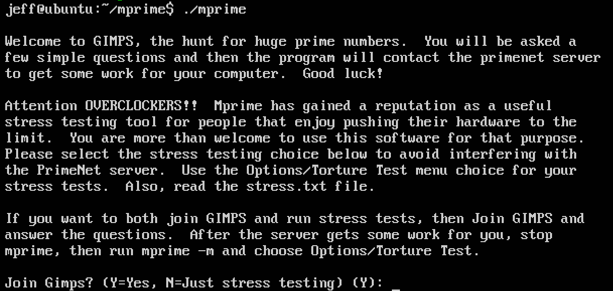 Now you have a copy of mprime in your user directory. Start it by typing ./mprime