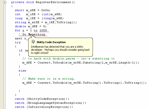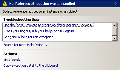 VS.NET 2005 also offers just-in-time intellisense for exceptions, which can be customized by editing the underlying XML. The intellisense for a NullReferenceException isn't very helpful for a developer like Stinky; here's one way K. Scott Allen improved it: