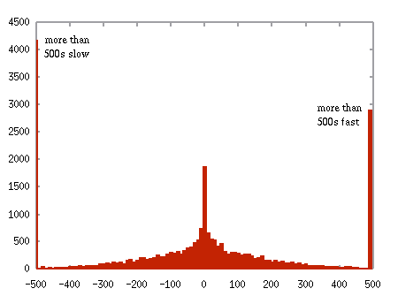 PCs aren’t very accurate timekeepers. The distribution of times reported here is a little disturbing, as are the giant peaks on the extreme left and right of the graph. The PCs with wildly inaccurate clocks outnumber those with accurate clocks about 2:1.