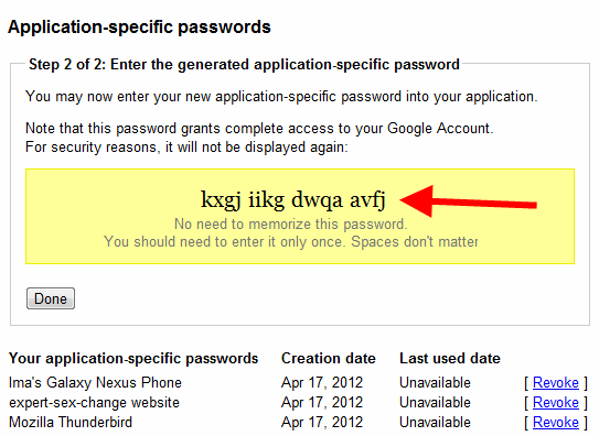 This effectively creates a list of passwords specific to each application. So you can see the date each one was last used, and revoke each app’s permission to touch your email individually as necessary without ever revealing your primary email password to any application, ever. See, I told you, there is a method to the apparent madness.