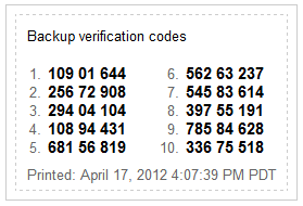 This also includes the never-fails-always-works option: printing out the single-use backup verification codes on a piece of paper. Go do this now. Right now! And keep those backup codes with you at all times. Put them in your wallet, purse, man-purse, or whatever it is that travels with you most often when you get out of bed.