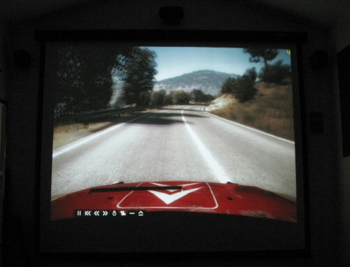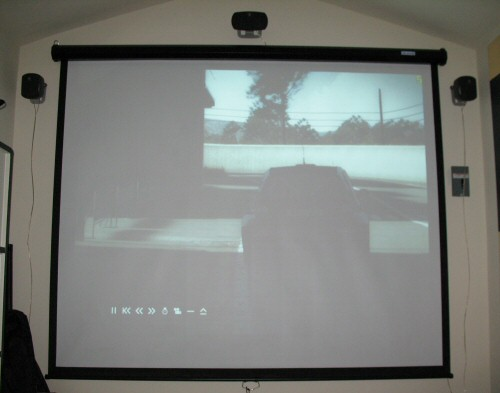 I used a typical 4:3 business class projector, mounted on a shelf at the rear top of the room. The screen is the largest that would fit in the space. I’ve also mounted the 5.1 speakers on the wall, as you can see. The two rear speakers are on the opposite wall behind us, and the subwoofer sits in a rear corner.