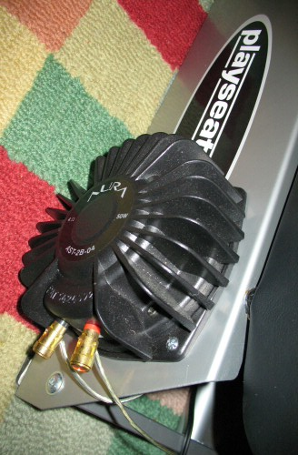 The amp is dedicated to driving the two 50 watt Aura shakers, which I’ve drilled and mounted on each side of the seat platform. The bottom of the aura has a cork backing, so there’s no metal-to-metal contact.