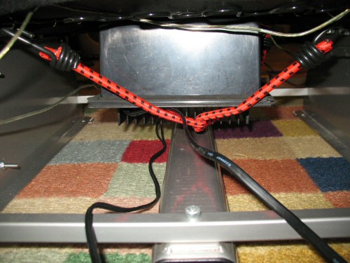 The other item of interest here is the bass shakers. I split the PC audio between the PC and the 100 watt subwoofer amplifier, which is strategically mounted under the seat via bungee cords. I also tuck most of the wires under there.