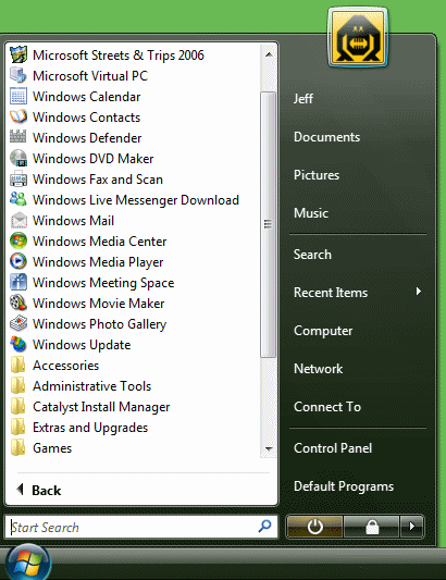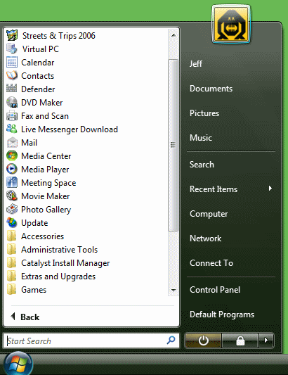 At least the Vista start menu lets me do a containing search, so if I start typing ‘fax,’ the menu dynamically filters itself to show only items containing what I typed. The revamped Start menu is one of my favorite Vista features; it directly addresses XP’s abysmal start menu user experience.