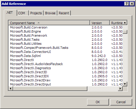 Unfortunately this dialog does not support containing search – only “starts with” search – so it’s a royal pain to find what I need. This is a concrete example of how unnecessary namespacing hurts usability. Thank goodness the System namespace is actually named System and not “Microsoft.Windows.dotNet.System.”
