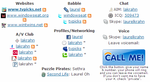 Laurel Krahn created one of the first 30 weblogs back in 1998. Her home page paints a similarly fractured picture of her online identity. I count 21 different websites that represent some part of Laurel: