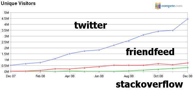 Stowe Boyd illustrated his point about FriendFeed with a graph comparing Twitter and FriendFeed traffic. Allow me to update Mr. Boyd's graph with another data point of my own.
