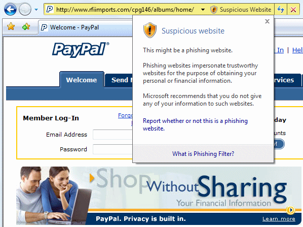 IE7 opened some of the recent phishing sites with no warnings at all. But a few triggered the heuristic check for “suspicious,” with a dropdown warning obscuring part of the site: