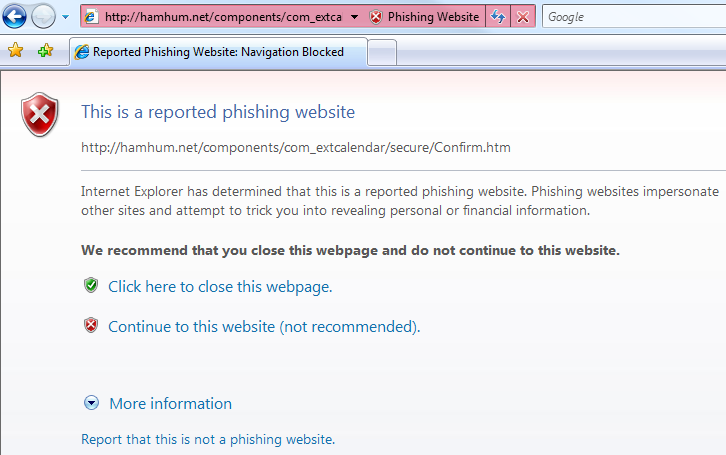 Others made the IE7 blacklist and were blocked completely behind a gateway page. I prefer this to the Firefox approach; once the URL is reported as a phishing site, there’s absolutely no reason to show any of its content to the user.