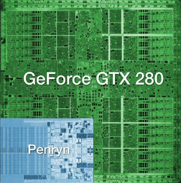 This topic is particularly relevant in light of today's introduction of NVIDIA's newest video card, the GTX 280, which contains a whopping 1.4 billion transistors. That's a lot. For context and scale, here's a shot of the 280 GPU next to a modern Intel dual-core CPU.