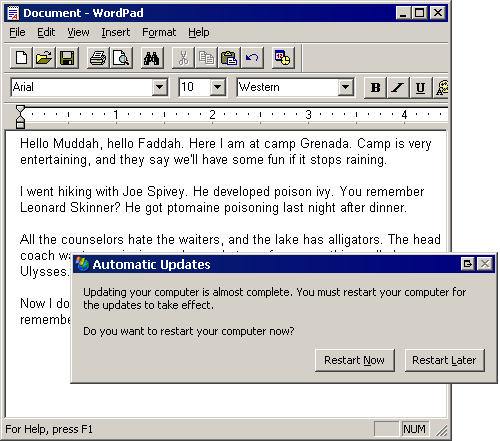 But it can be worse. So, so much worse. If you happen to be typing something that can be interpreted as an action by that dialog-- and remember, pressing the space bar is the same as clicking a button when it happens to have the focus -- you could suddenly and very much accidentally be in a world of pain. Like this poor, unfortunate soul, who recently posted a plaintive comment to my XP Automatic Update Nagging post.