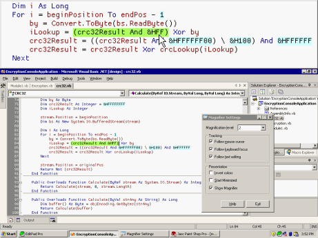 In the screenshot above, I have the magnification window docked to the top of the screen. The IDE is maximized normally under it. Since magnify follows all my mouse and keyboard actions automatically, everything I do is now perfectly visible – even from the last row of the room.