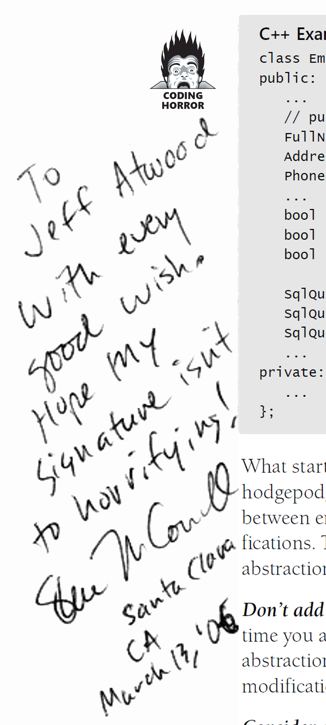 Update: Steve was very gracious, talking at some length with me both before and after his keynote. He even signed my copy of Code Complete 2. As he said, "I guess I should sign on a page with a Coding Horror":