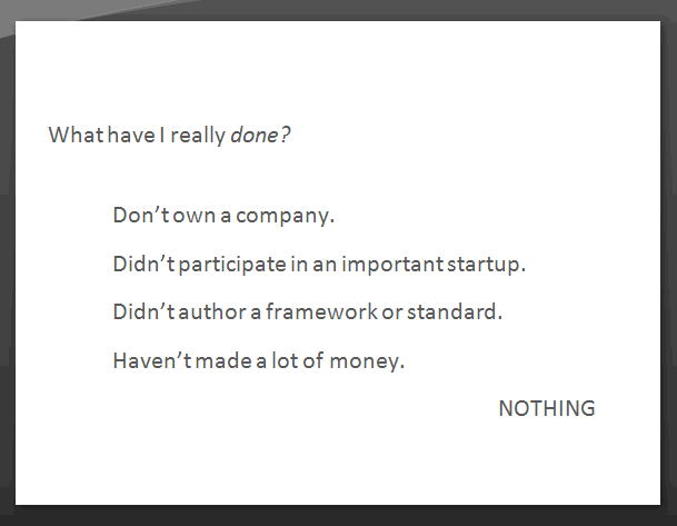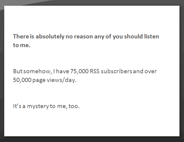 But I worry that for some, it's getting in the way, damaging the credibility of the underlying message. Instead of arriving at the desired learning part, all they're getting is the smackdown. I certainly hope my posts are read and understood as slightly more nuanced than "Everything About PHP Sucks", "Everything About XML Sucks", or my personal favorite, "Everything About (your favorite technology) Sucks. Seriously."